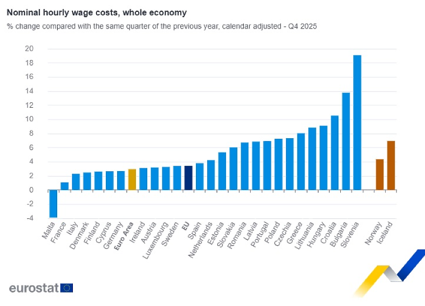 През четвъртото тримесечие на 2025 г. в сравнение със същото тримесечие на предходната година, най-голямо увеличение на разходите за почасово заплащане за цялата икономика е регистрирано в Словения (+19.1%), България (+13.8%) и Хърватия (+10.5%).