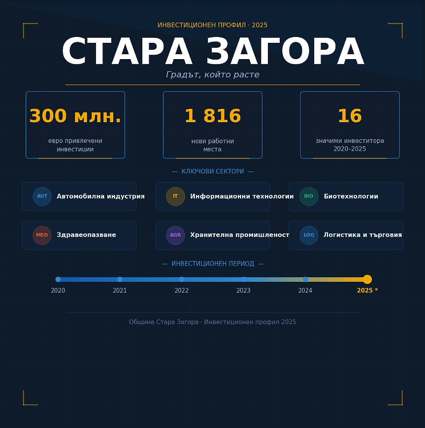През 2025 г. привлечените инвестиции в общината достигат внушителната сума от 300 млн. евро, като с тях се планира разкриването на общо 1816 нови работни места. В периода 2020–2025 г. в Стара Загора са привлeчени 16 значими инвеститори.