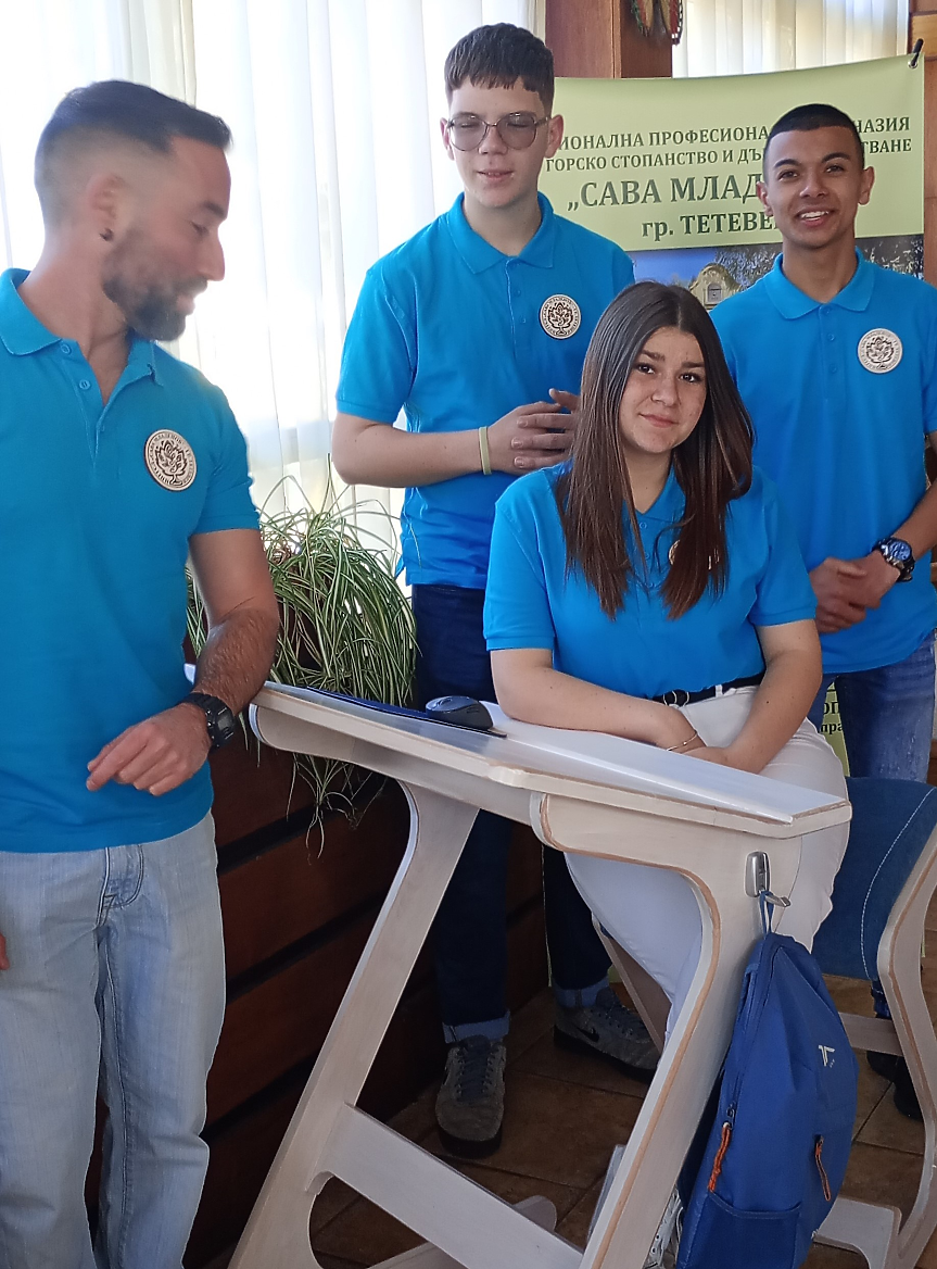 Ученици от Националната професионална гимназия по горско стопанство и дървообработване в Тетевен изработиха ергономичен чин, който предотвратява гръбначните изкривявания.