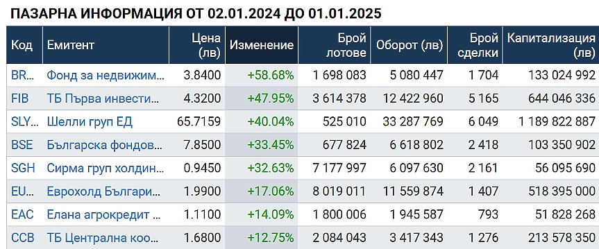 Рекордьорът за 2024 г. е Петрол, добавил 117.50%, докато София комерс – заложни къщи поскъпна със 75.42%.