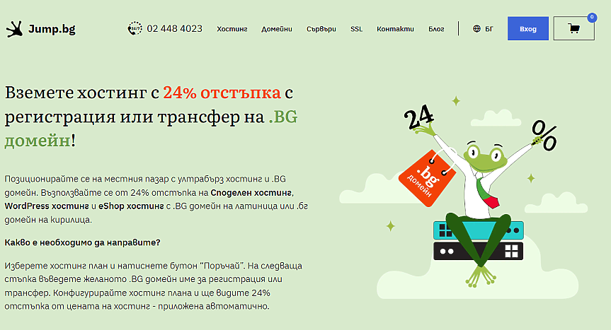 Компанията предлага 24% отстъпка от цената на хостинг при закупуване с .BG домейн. От Jump.BG дават възможност регистрацията на домейн името да бъде с разширение .BG - на латиница или .бг на кирилица.