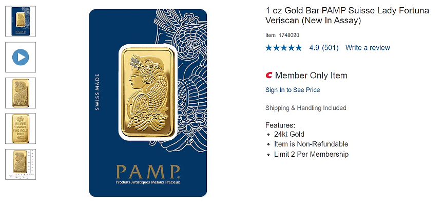 Сайтът предлага два вида 24-каратово злато. Кюлчето от Южна Африка струва 1 949.99 долара, а това с метал от Швейцария – 1 979.99 долара.